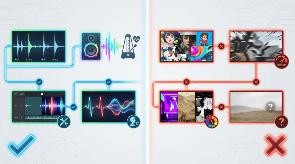 - Align strong visual accents (flashes, color shifts, camera moves) to key musical hits.