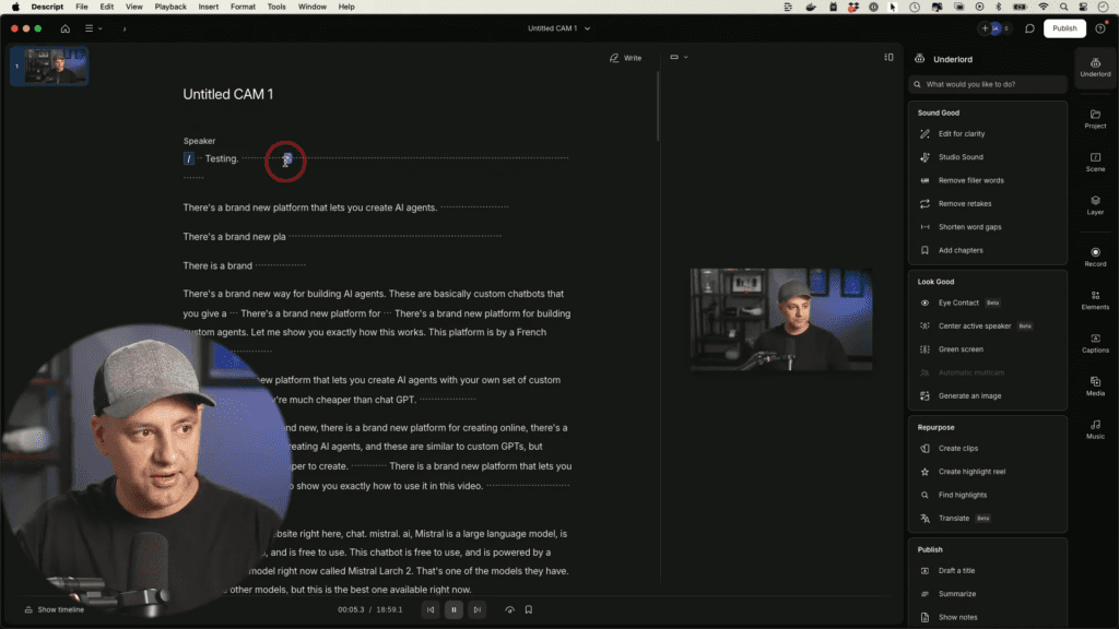 Silence and filler removal: Automatically identifies and removes pauses, “ums,” and repeated takes. This single feature can reduce a 30-minute talking-head edit to under 10 minutes of active work.